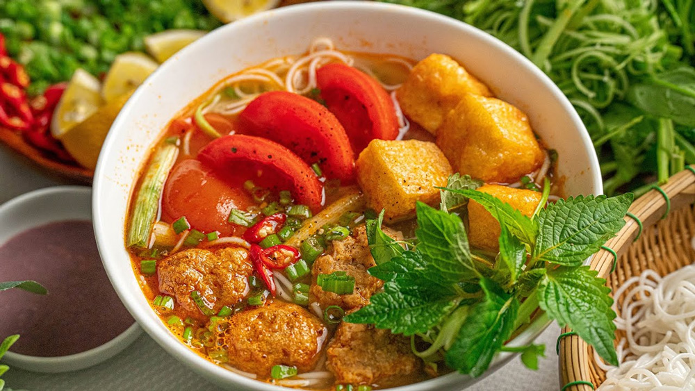 A bowl of crab noodle soup, rich with the tangy aroma of vinegar, fatty crab paste, crispy fried tofu, and fresh vegetables, is perfect for hot summer days. You can visit: